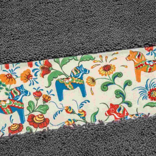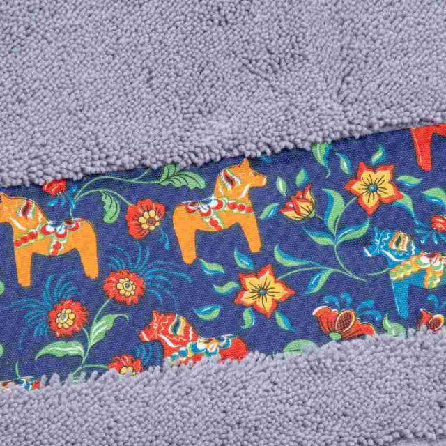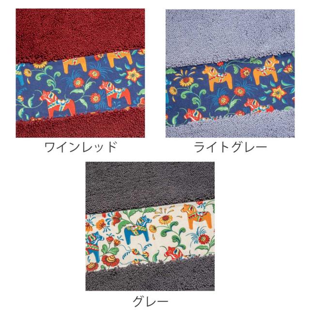 パイル生地と、綿のプリント生地のラインがアクセントになったダーラヘスト柄のキッチンマットです。北欧で生まれたダーラヘストは幸せを運んでくれる馬と言われ、世界中の人たちに親しまれており大切な人への贈り物として人気があります。50×180cmはどんなキッチンにもフィットするサイズで、ベッドサイドにもお使いいただけます。