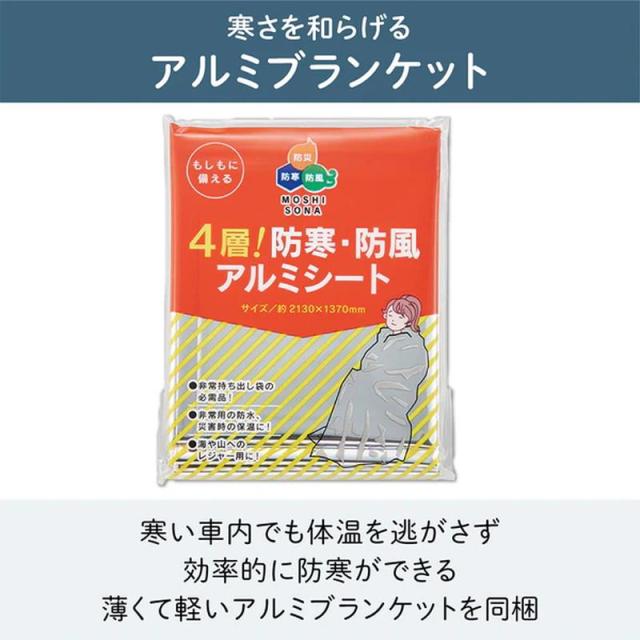 セット内容:保存水(500ml)、クッキー(3本入)、備蓄氷糖×2個、非常用簡易トイレ×3個(汚物収納袋+抗菌性凝固剤)、ホイッスル、軍手、マスク、アルミブランケット、アイマスク、ポケットティッシュ、連絡カード、ペン(鉛筆芯)