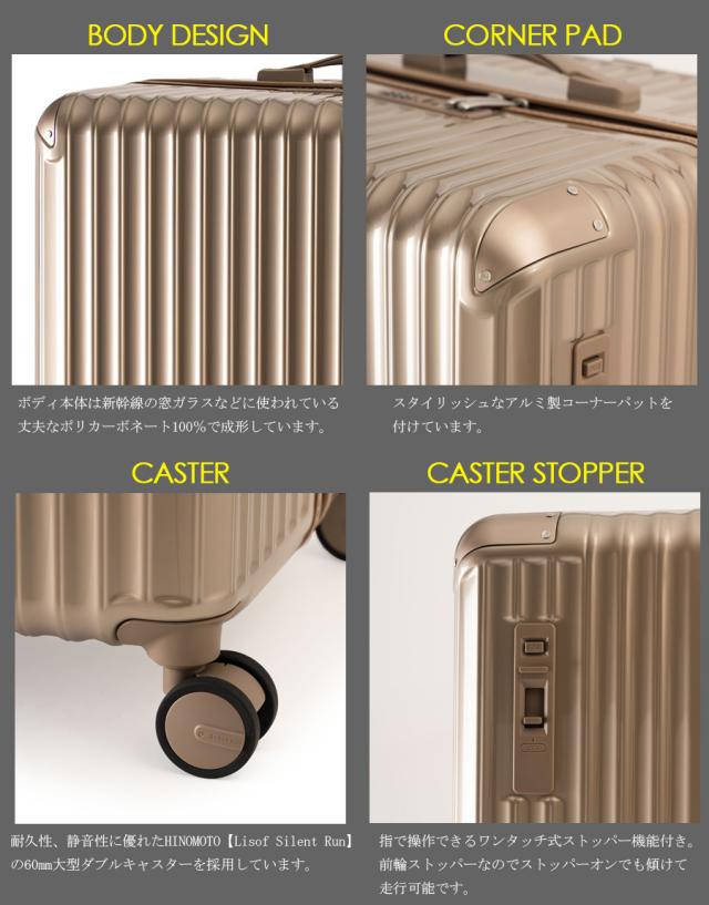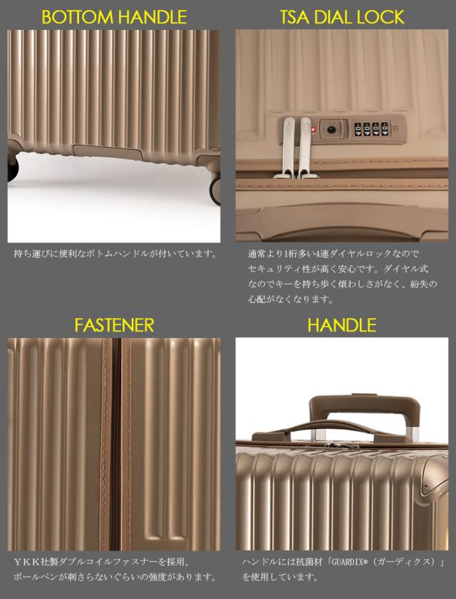 備考:前輪キャスターストッパー / 4連ダイヤル式TSAロック / 抗菌ハンドル / 高耐久YKKダブルファスナー / 大径60mmダブルホイール静音キャスター
