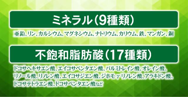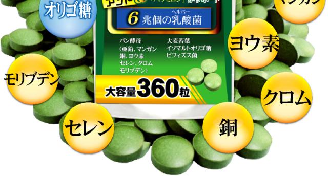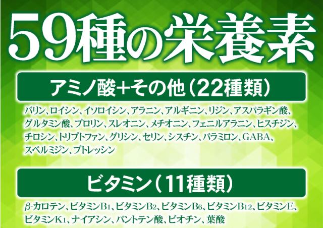 | 原材料名 | 大麦若葉粉末、麦芽糖、乳酸菌(殺菌)、デキストリン、ユーグレナ、イソマルトオリゴ糖、ビフィズス菌(殺菌)、パン酵母(亜鉛・マンガン・銅・ヨウ素・セレン・クロム・モリブデン含有)、ブドウ糖/結晶セルロース、微粒二酸化ケイ素、ステアリン酸カルシウム |