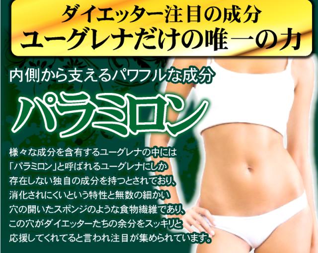 「様々な成分を含有するユーグレナの中には「パラミロン」と呼ばれるユーグレナにしか存在しない独自の成分を持つとされており、消化されにくいという特性と無数の細かい穴の開いたスポンジのような食物繊維であり、この穴がダイエッターたちの余分をスッキリと応援してくれてると言われ注目が集められています。