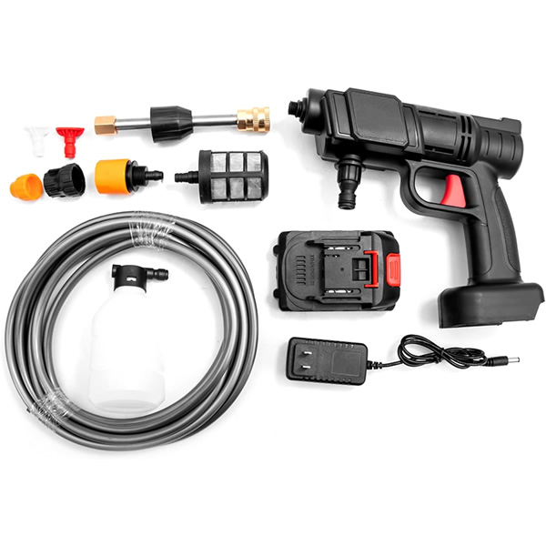 コンセントや水道がなくても使える充電式高圧洗浄機 ■サイズ:23×22×7.5cm 重量:653g ホース長さ:約5m ■電源:AC110V 充電時間:約4時間 使用時間:約20〜30分 ■材質:ABS樹脂、ステンレス ■吐出圧力:約24.5bar/350psi ※記載は商品仕様の一部です。仕様説明不足等の理由での返品はできません。特に適合等は必ずご確認ください。