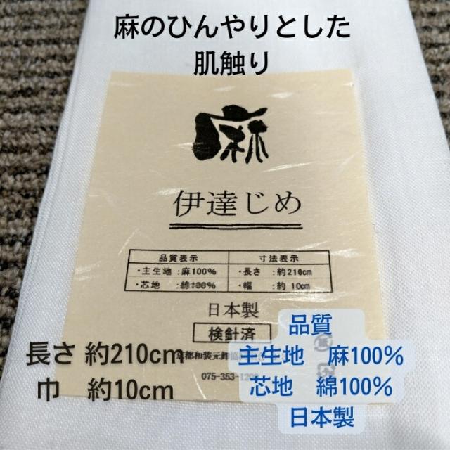 夏の伊達じめ 色はオフホワイトで麻独特のしゃきっとした 生地感と自然なシワが、見た目涼しげです 暑い夏はもちろん、暖房が効いてる冬にも汗が気になる方にはおすすめです