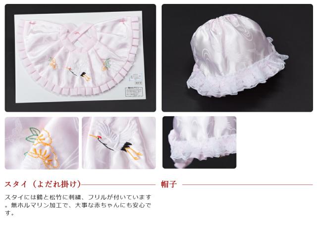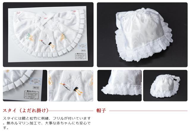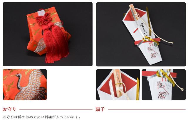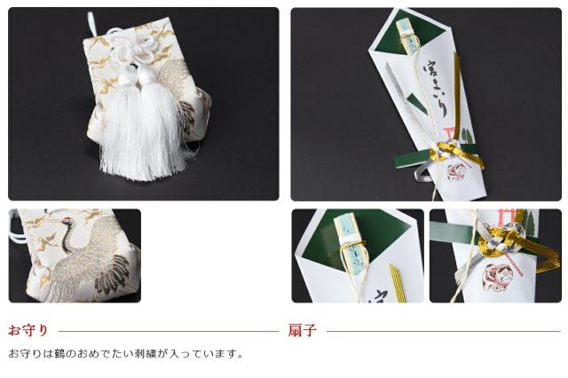 お宮参りに使う、よだれ掛け、帽子、お守り、末広扇子の4点セットです。お子様の健やかな成長を祈願できるお得なセットに、豪華!化粧箱、しおりも付いています!