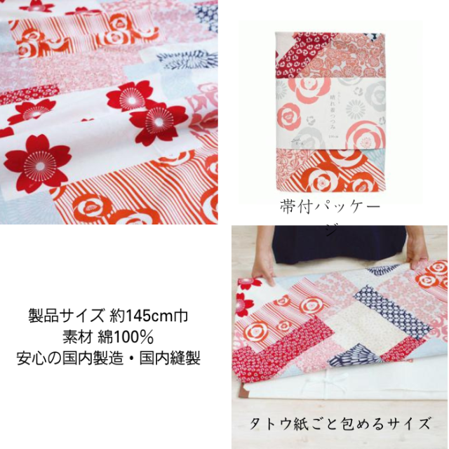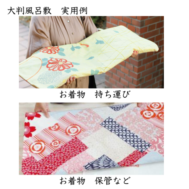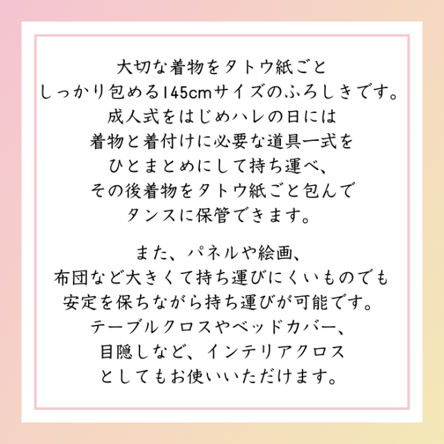 大判風呂敷は、145cmの大きさで綿100%の日本製です。特に着物やたとう紙を包むのに最適で、成人式などの特別な日に必要な道具をまとめて持ち運ぶことができます。着物をたとう紙ごと包んで保管するのにも便利です。また、パネルや絵画、布団などの大きな物も安定して運べます。さらに、テーブルクロスやベッドカバー、目隠しとしても活用でき、インテリアクロスとしてもおすすめです。