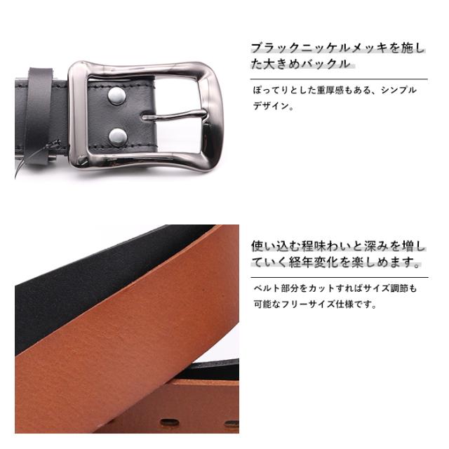 | ブラックニッケルメッキを施した、ワイルドな印象の大きめバックル 光沢感と厚みがある本革ベルトと、艶やかなバックルで大人っぽい印象に。 使い込む程味わいと深みを増していく経年変化を楽しめます。 ベルト部分をカットすればサイズ調節も可能なフリーサイズ仕様です。 |