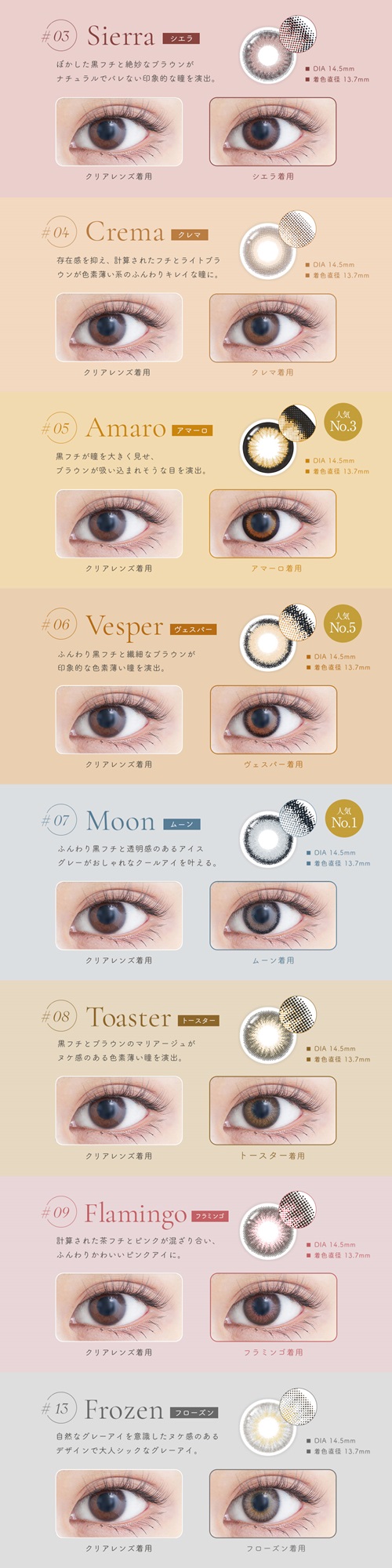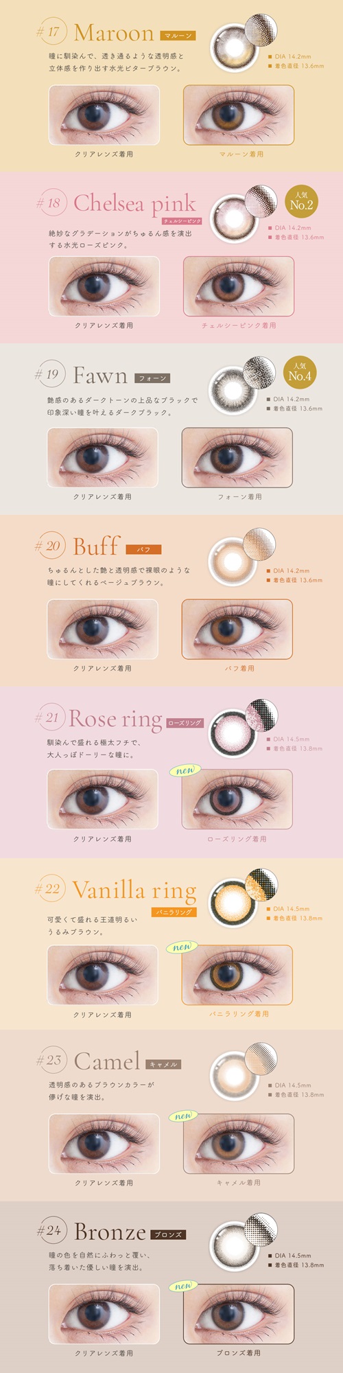 【14.5mm】#03シエラ、#04クレマ、#05アマーロ、#06ヴェスパー、#07ムーン、#08トースター、#09フラミンゴ、#13フローズン、#21ローズリング、#22バニラリング、#23キャメル、#24ブロンズ