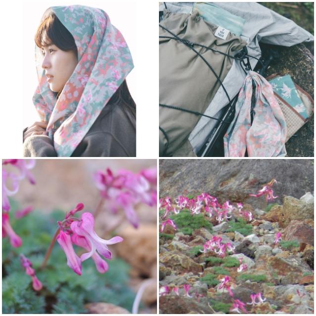 コマクサの花と葉、そして岩場の色を使用し、印象派のようなタッチのデザイン。