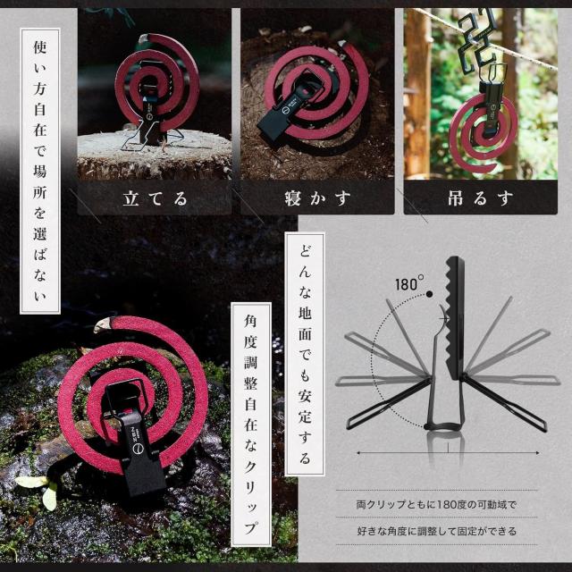【機能性】蚊取り線香を装着して立てる、寝かす・吊るすことが可能で、色々なシーンで活躍します。蚊取り線香の火が途中で消えることなく最後まで使えます。
