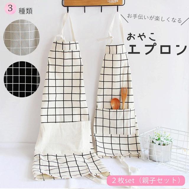 | 主な仕様 | 【セット内容】 大人用エプロン1枚、子供用エプロン1枚 【カラー】ブラック、グレー、ホワイト 【サイズ】 (大人用)生地部分の着丈75cm、身幅58cm (子供用)生地部分の着丈55cm 身幅39cm (採寸方法や仕入時期により、多少の誤差がございます。ご了承下さい) ◆素材:コットン |