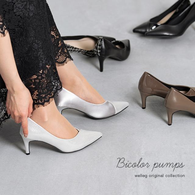 パンプス 走れる 履きやすい 走れるパンプス レディース ポインテッドトゥ ポインテッド とんがりトゥ Vカット 異素材 バイカラー ピンヒール 高反発クッション 高反発 クッション 屈曲性 痛くない 歩きやすい 疲れない 疲れにくい 大きいサイズ 小さいサイズ 幅広 デート おでかけ お出かけ カフェ ショッピング 買い物 OL オフィス オフィスカジュアル ビジネス リクルート 会社 仕事 仕事用 職場 職場用 通勤 立ち仕事 お呼ばれ パーティ パーティー フォーマル 冠婚葬祭 結婚式 参観 卒園式 卒業式 二次会 入園式 入学式 発表会 披露宴 屋外 外履き デイリー 日常 普段使い 日常使い 普通履き 7cmヒール 7センチヒール ハイヒール 3E 黒 ブラック 灰 肌色 グレー ベージュ グレージュ 銀 シルバー 21.5cm 22cm 22.5cm 23cm 23.5cm 24cm 24.5cm 25cm 25.5cm 26cm 26.5cm 春 夏 秋 冬 スムース調 合皮 PU 布 クロス ツイード サテン outletshoes アウトレットシューズ welleg ウェレッグ