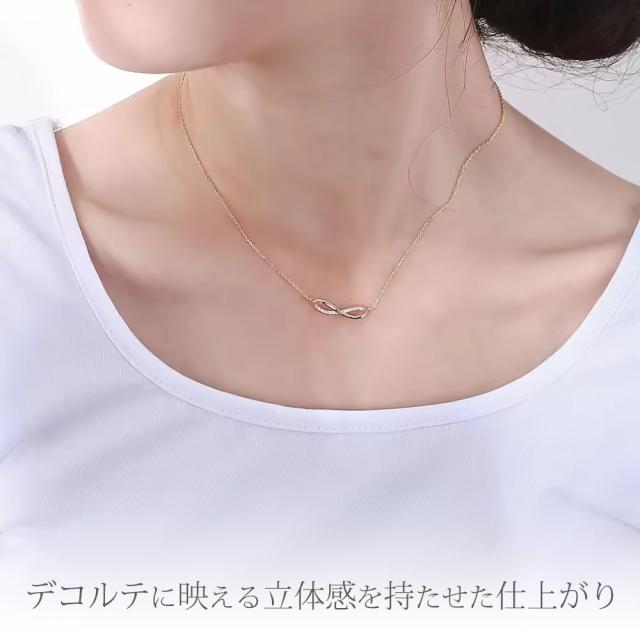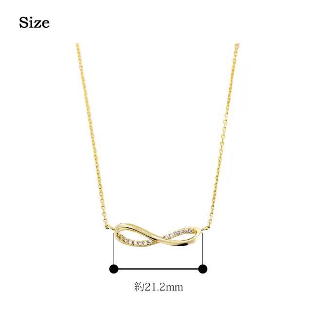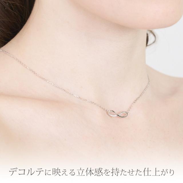∞のモチーフに丸みを持たせ、シンプルながら退屈させないデザイン。緩やかなカーブはデコルテの上で揺らめくように遊び、繊細なジルコニアを輝かせます。