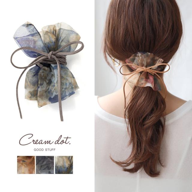上品な透け感とロングスエード調のコードを合わせたくしゅくしゅポニーフック。オーガンジー素材とシックなタイダイ柄が大人っぽく身につけられるアイテムです。簡単なヘアアレンジも一気に華やかでこなれた印象に◎