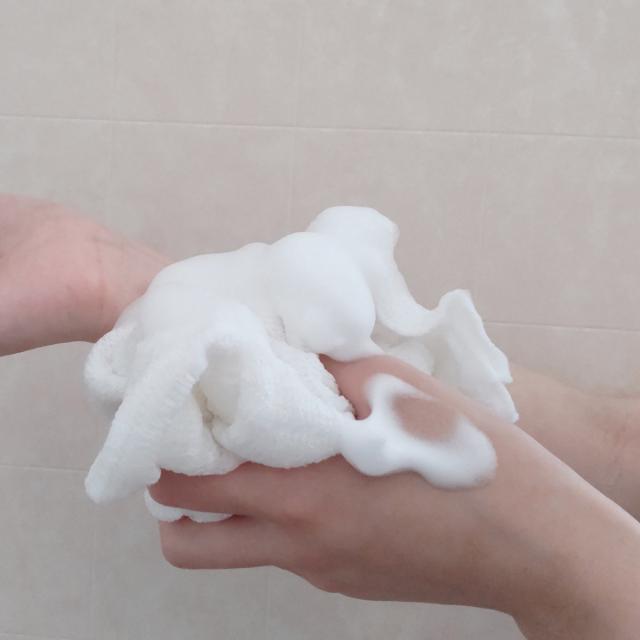 お湯で濡らしたタオルに泡ボディソープを適量つけて泡立てると、たっぷりと泡立ちます。手洗い感覚で洗えるやわらかタッチで、お肌をいたわりながら優しく洗えます。