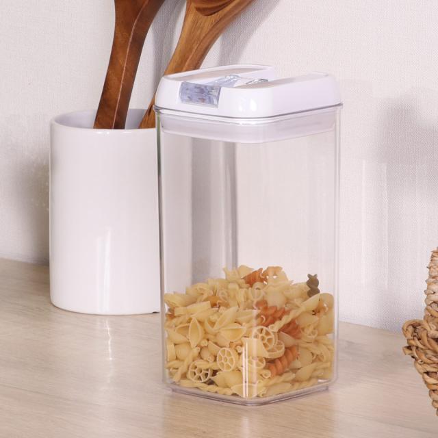 角のない四角形で掴みやすい1.1Lの保存容器です。落としても壊れにくく、軽くて使い勝手の良いプラスチック製で、ショートパスタやシリアルなどの保存にぴったりです。