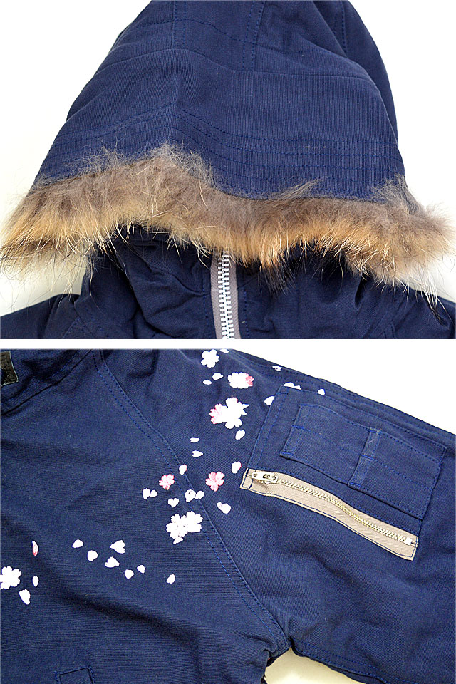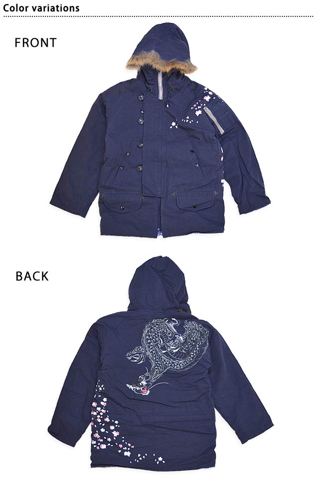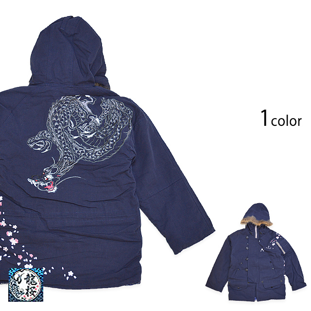 スクリプト花旅楽団の姉妹ブランドの龍桜より「N-3Bジャケット(RN3-110)」のご紹介です。 ミリタリーと和柄を融合させた、寒い季節にぴったりのアウターが登場しました! ボディーには丈感の長いN-3Bジャケットを採用。 フードにはファーが付いており、防寒性にも優れたアイテムです。 背中には人気の龍をダイナミックに刺繍。 桜吹雪を組み合わせ、一枚で主役級のアイテムを完成させました。 前立てはボタンとジップの二重構造。 身頃や袖にはポケットが縫い付けられています。 | ||||||||