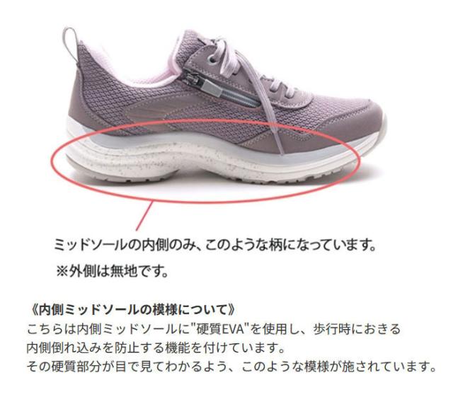 靴底のねじれを防ぐ軽量硬質EVAシャンクと、内外に高度差をつけてかかとの着地時の安定性を高めた'高弾性EVA'を組み合わせたミッドソールにより、快適な歩行をサポートします。
