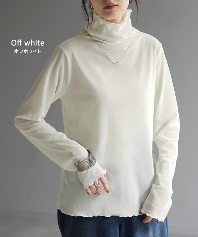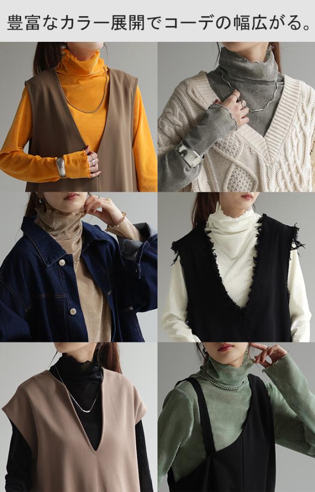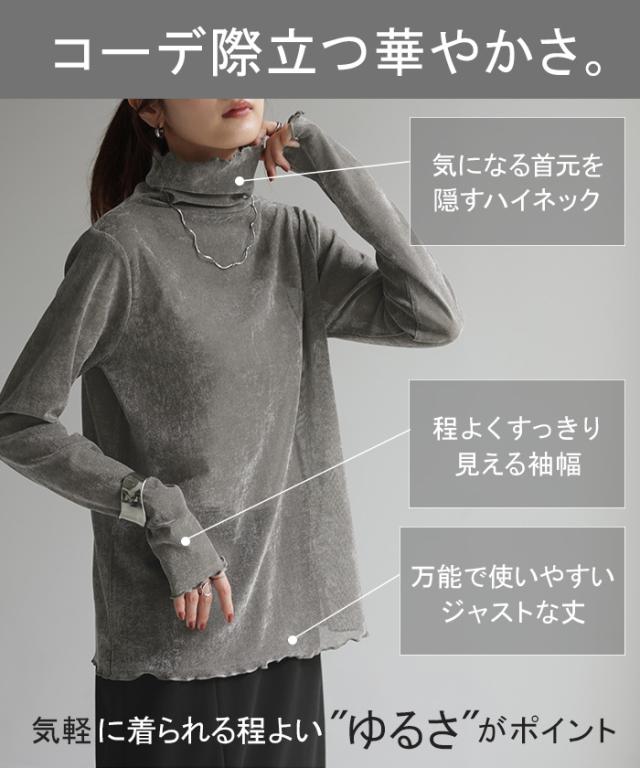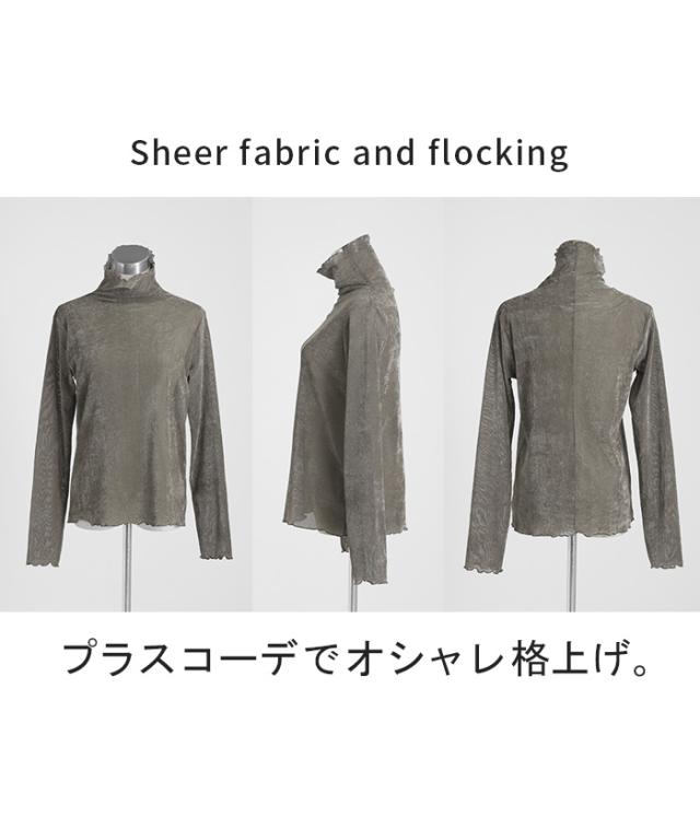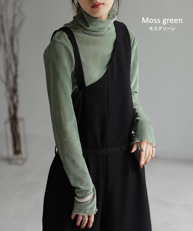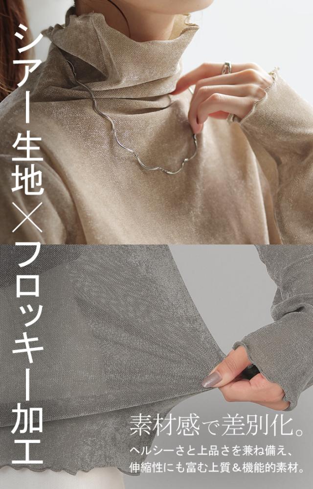 ロンT レイヤード シアー ベロア フロッキー シースルー シアートップス レディース ゆったり 肌隠し インナー 長袖 透け 重ね着 薄手 タートル ハイネック メロウ タートルネック きれいめ 体型カバー ストレッチ 無地 グリーン 黒 白 春 夏 HUG.U 秋新作