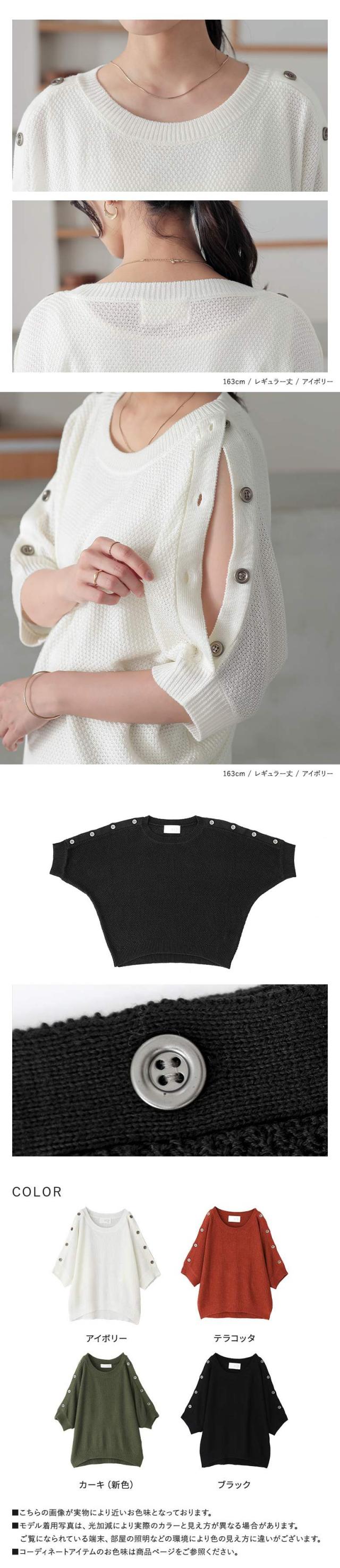 【新色・新サイズ登場】『ショルダーボタン5分袖デザインニット』※メール便可※【10】[ニット レディース 秋 トップス 半袖 五分袖 ボタン 肩ボタン ショルダーボタン 無地 鹿の子編み]