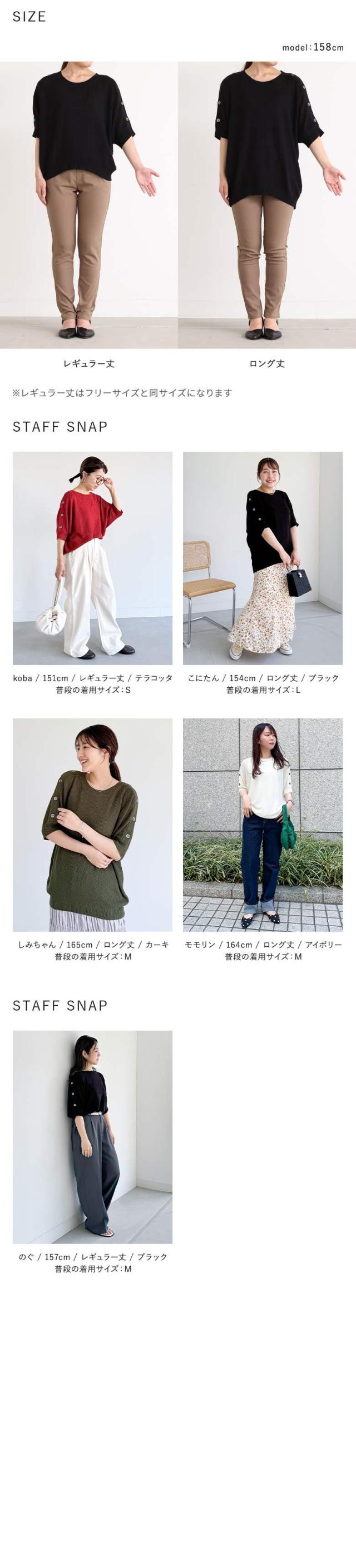 | staff:V/155cm B76.5 W63 H88 【普段着用】 Tops: S/M Bottoms: S/M | 【レギュラー丈】 袖丈:ちょうどひじが隠れる位 着丈:ヒップにかかる位 腕周り:ややゆったり バスト:ややゆったり 全体:ややゆったり 【ロング丈】 袖丈:ちょうどひじが隠れる位 着丈:ヒップがすっぽり隠れる位 腕周り:ややゆったり バスト:ややゆったり 全体:ややゆったり 生地が柔らかいので体型カバーをしながらゆったり着用できました。ロング丈は、腰回りが気になる方にオススメです。 |