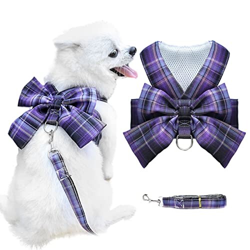 【魅力的な犬のハーネスリードセット】ユニークな犬のハーネスリードセットは目を引く蝶結びとマッチしていて、可愛くて、ペットへの完璧なプレゼントです。おしゃれでクラシカルなチェックデザインを採用した犬ハーネス。美しくてかわいいペットを連れて出かけると、注目を集めます。