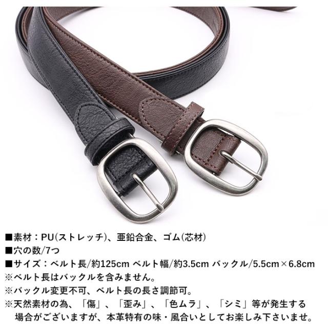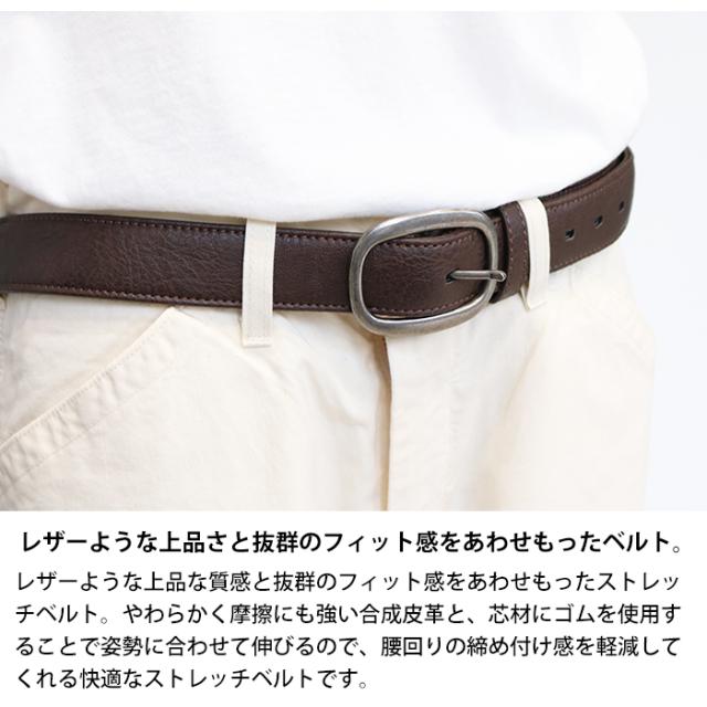 | レザーような上品な質感と抜群のフィット感をあわせもったストレッチベルト。 やわらかく摩擦にも強い合成皮革と、芯材にゴムを使用することで姿勢に合わせて伸びるので、腰回りの締め付け感を軽減してくれる快適なストレッチベルトです。 カジュアルからビジネスまでスタイルを選ばず使える万能ベルトです。 ベルト部分をカットすればサイズ調節も可能なフリーサイズ仕様です。 |