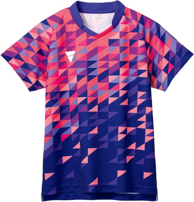 2021年の全日本選手権モデル(カラー/色番4020 グリーン×オレンジ、色番9050 レッド×ブルーの2色を選手着用)。肌触りがよく吸汗速乾性に優れた軽量の素材を使用したゲームシャツです。New Colorとしてグリーンとレッドを採用しました。2面によるVICTASのアイコニックデザインを取り入れ、新しい造形と色幅に挑戦したデザインです。ゲームパンツ(品番/V-GP221)とのセットアップデザインとなっています。
