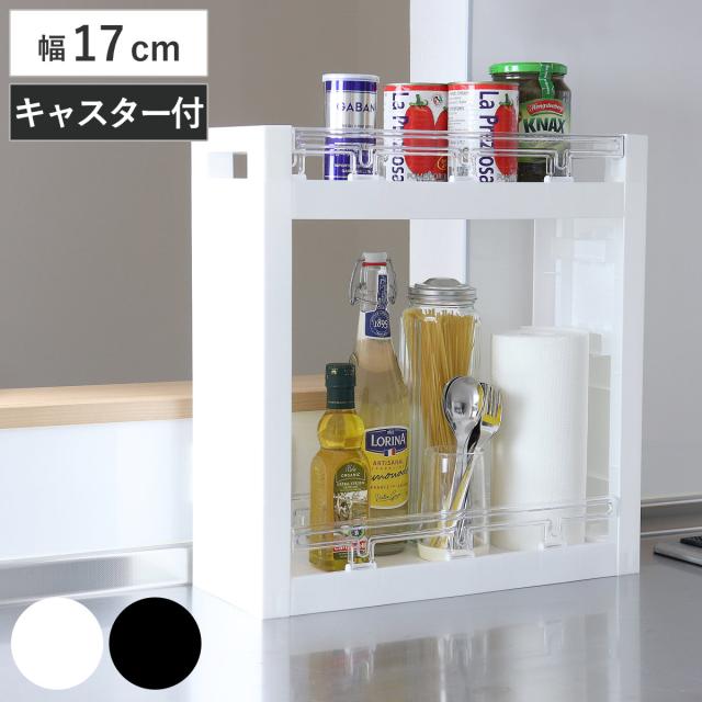 ![]() コンロ周りのスパイス、調味料をすっきり整頓できる2段収納ラック | ![]() 冷蔵庫横などの隙間を活用できる幅17cmのスリムワゴン |