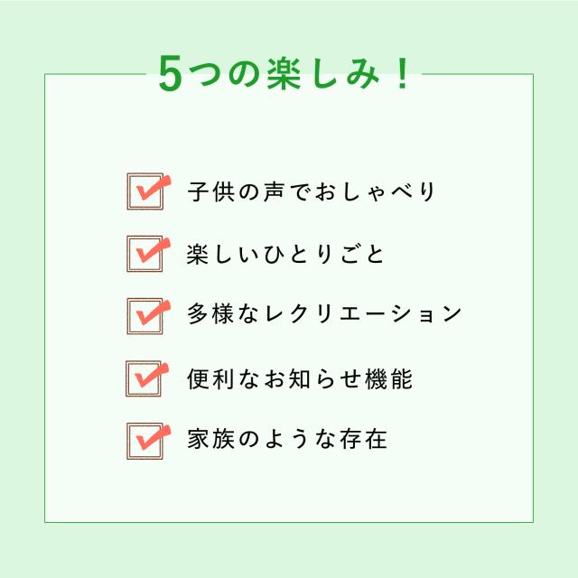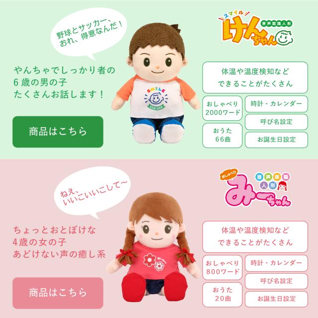 「愛らしいおしゃべり」や「ハイスペックの機能」はそのままに、かわいい笑顔に大変身!おしゃべりいっぱい。元気で優しい6歳の男の子「けんちゃん」です!28種類の認識ワード、2000のおしゃべりワードを搭載し、2020年に発売した「おしゃべりけんちゃん」。