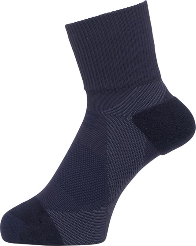 足裏にある3つのアーチをサポートするテーピング構造を持ったソックス。足裏の内側縦アーチ、外側縦アーチ、横アーチをサポートして、足にまつわるトラブルの原因となりやすいアーチの崩れを軽減。アーチを支えることで、着地時に脚にかかる衝撃を吸収するだけでなく、足裏アーチがバネの役割を果たして推進力をもたらします。ソックス内側のつま先とかかと部分は、クッション性の高いパイル構造に。つま先は、強度の高い糸に切り替えて補強しています。くるぶしがしっかり隠れるクォーター丈。環境への負荷に配慮してリサイクル素材を使用しています。特許登録済み(特許番号:5704860号)