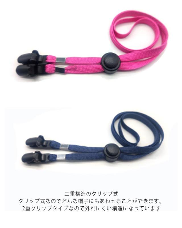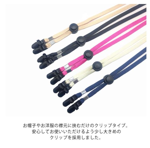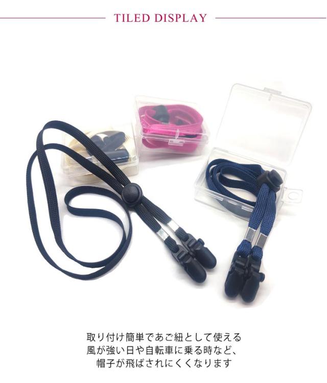 | 帽子を風から守る! どの帽子にも取付けできるクリップ式あご紐 全10色 【3枚セット 収納ケース付き】 取り付け簡単であご紐として使える♪ 風が強い日や自転車に乗る時など、帽子が飛ばされにくくなります♪ お帽子やお洋服の襟元に挟むだけのクリップタイプ。安心してお使いいただけるよう少し大きめのクリップを採用しました。 CAP型の帽子にぴったりあわせやすいあご紐タイプの帽子ストラップ。 ハットにも使用可能。帽子の内側の折り返しに付ければ見た目もすっきり♪ 簡単楽ちん♪サイズ調整。押しながら上下させるだけで簡単に調整いただけます。 約80cmの余裕を持った長さなので操作もしやすくおしゃれな印象♪ レディース・メンズ・子供からお年寄りまで使える帽子クリップ! <details> 01.二重構造のクリップ式 クリップ式なのでどんな帽子にもあわせることができます。2重クリップタイプなので外れにくい構造になっています 02.プッシュ式でかんたん長さ調整 サイズ調整が簡単にできるプッシュタイプを採用。帽子をかぶるときや脱ぐときの煩わしさを軽減します 03.専用の収納ケース付きで保管にも便利 個包装のケースに入っているので、衛生的に保管できます。ケースに入れて持ち運びもOK! | |