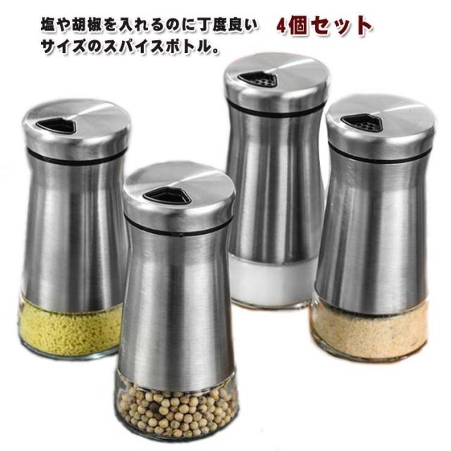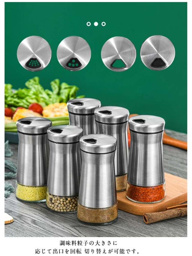 | 塩や胡椒を入れるのに丁度良いサイズのスパイスボトル。4個セット 調味料粒子の大きさに応じて出口を回転 切り替えが可能です。 残量を把握しやすいガラス製です。 | |