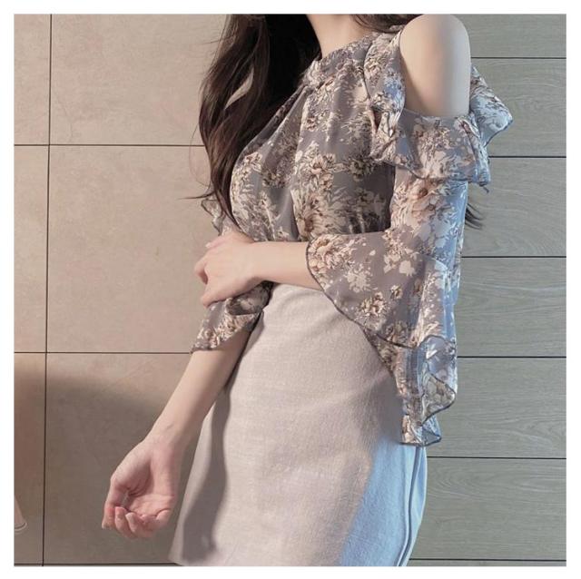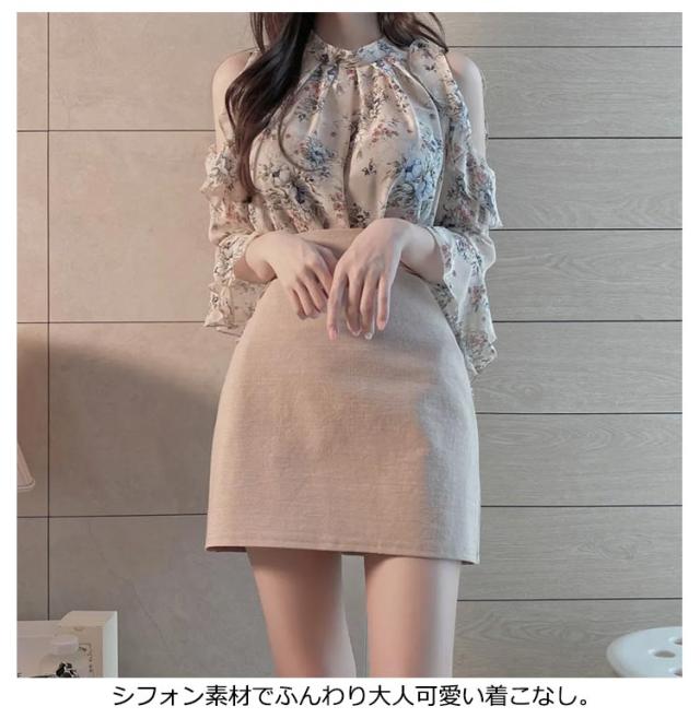 レディース シフォン ブラウス 半袖 オフショル シャツ 七分袖 肩出し 肩見せ ミセス シファンブラウス フレア袖 トップス 花柄 シャツ カジュアル ホルターネック 大人 上品 きれいめ 可愛い オープンショルダー オフショルブラウス 肩開き オフィス 送料無料