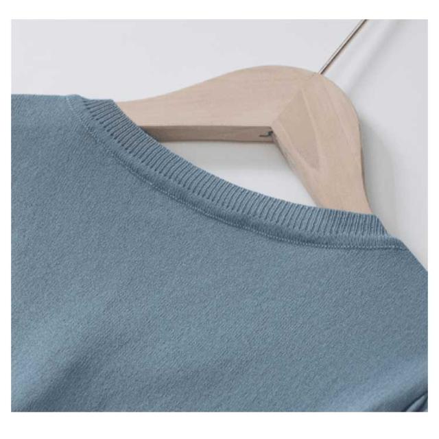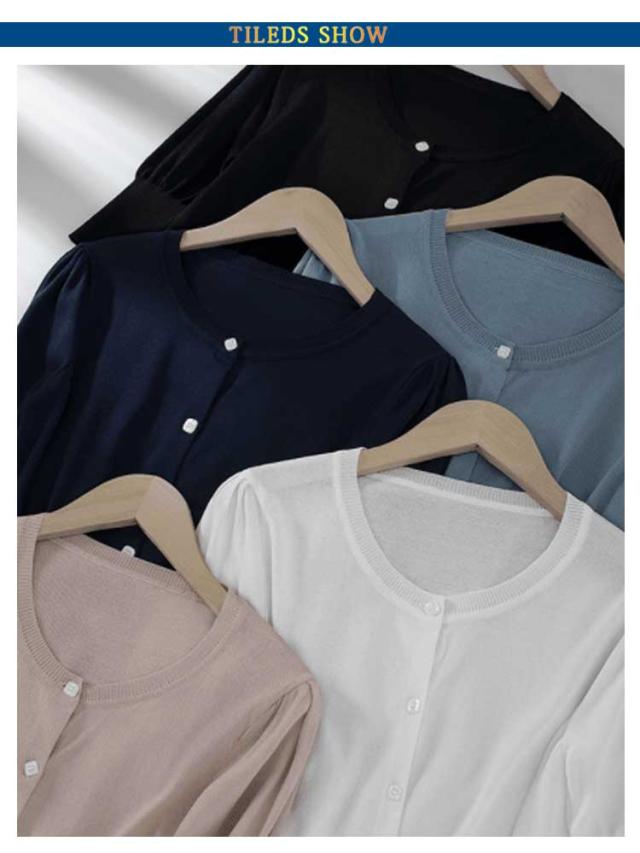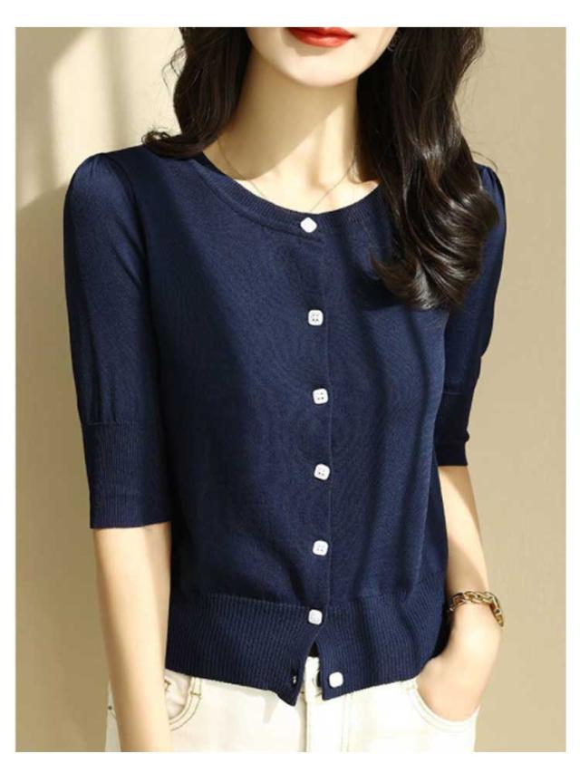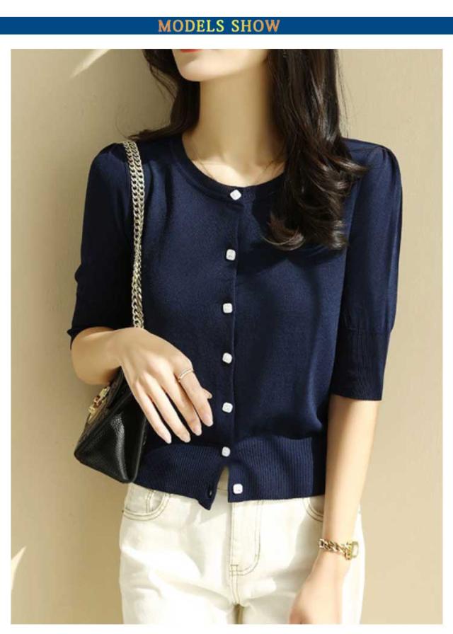 | 暑い季節も涼し気に!ひんやり涼しいニットカーディガン登場!! 薄手のニット素材で涼しい着心地を叶えてくれます。 二の腕をさりげなくカバーしてくれる五分袖なのも嬉しいポイントです。 フロントのボタンがアクセントとなっており、一枚着としての着用もおすすめ。 | |