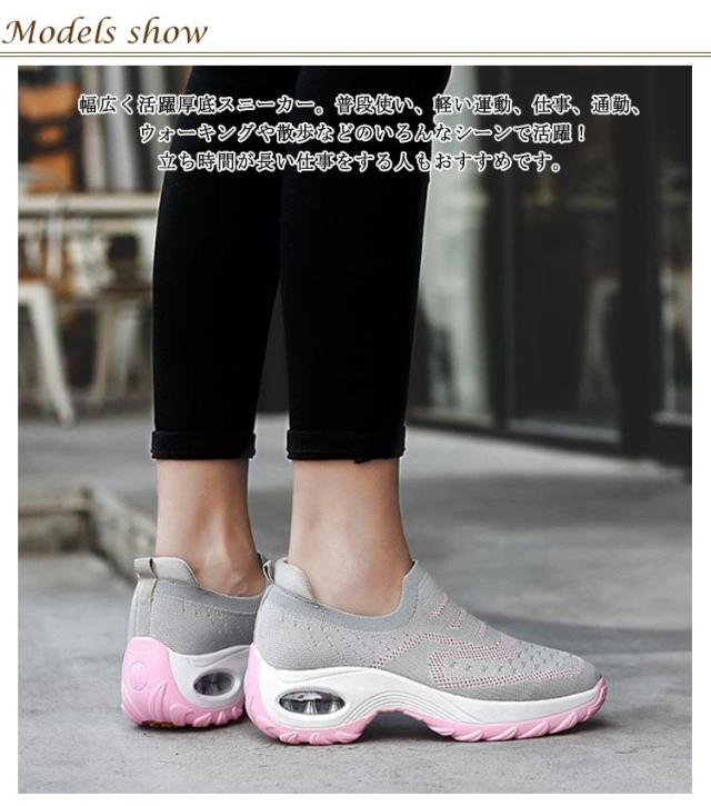 | 22.5-27cm 毎日履きたい、履きやすい紐なしスニーカー! エアクッション付きなスニーカーはクッション性に優れ、踏み込む際の衝撃を吸収し、長時間のウォーキングや立ち仕事での疲労を大幅に軽減します。 脱ぎ履き簡単!靴ひもがなし、履き口は伸縮性に優れているので、脱ぎ履きがしやすいです。 美脚効果!5cm厚底で、履くだけでスタイルアップ!脚長効果抜群。 通気性 アッパーはニット素材を採用して、ムレ防止を実現しました!長く履いても快適に過ごせるようとことんこだわりました。 幅広く活躍厚底スニーカー。普段使い、軽い運動、仕事、通勤、ウォーキングや散歩などのいろんなシーンで活躍!立ち時間が長い仕事をする人もおすすめです。 ニット素材なので春夏はもちろん秋冬にも♪オールシーズン履く事ができます! | |