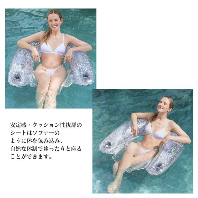 | 転倒や傾きにくいU字型のデザインで、水の上でのんびりリラックス! ドリンクホルダーのついた浮き輪なので、プールの上でぷかぷか浮かぶのにおすすめですよ! 安定感・クッション性抜群のシートはソファーのように体を包み込み、自然な体制でゆったりと座ることができます。 背もたれがついているのでぷかぷかと水の上でリゾート気分を楽しめます。楽な姿勢で座ることができます。 シルバーとパープルの2色からお好きなカラーを選べます。 | |