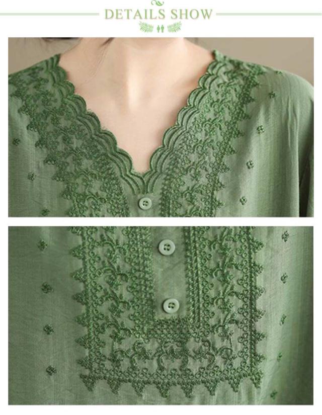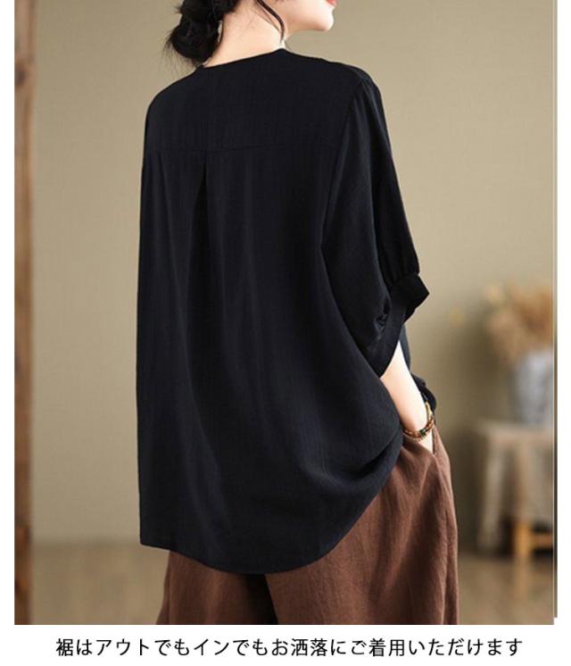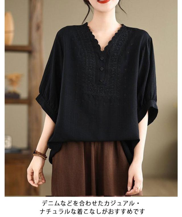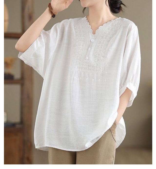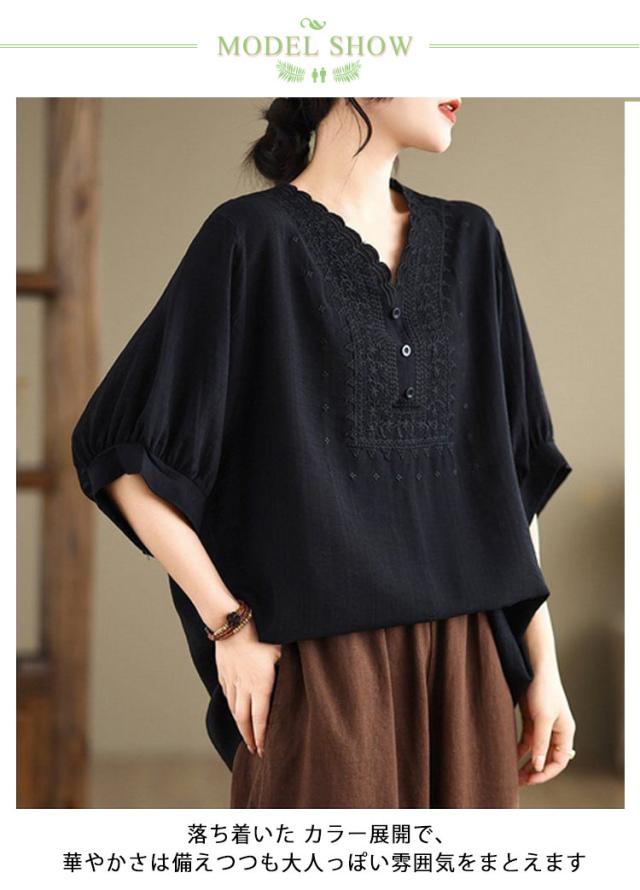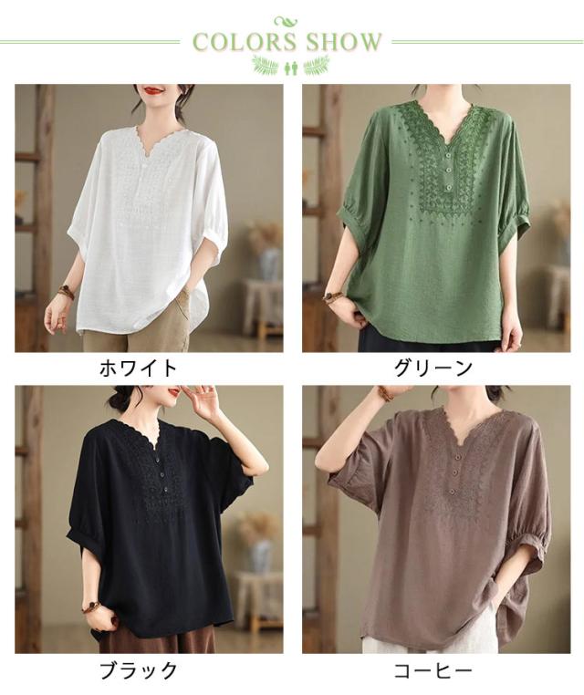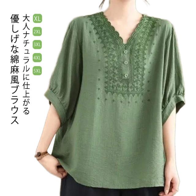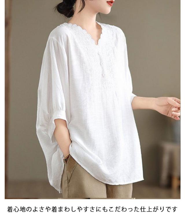 コットン シャツ リネン レディース プルオーバー ブラウス シャツ チュニック Vネック 七分袖 ふんわり 花柄 綿麻風ブラウス ブラウス 大きいサイズ ゆったり 体型カバー 刺? 花柄 大きいサイズ ゆったり ナチュラル きれいめ