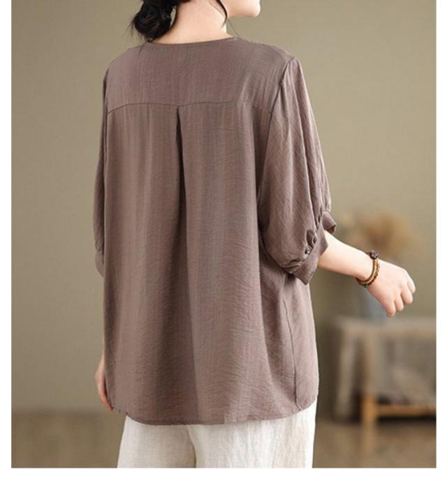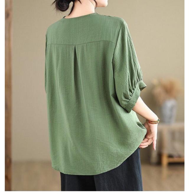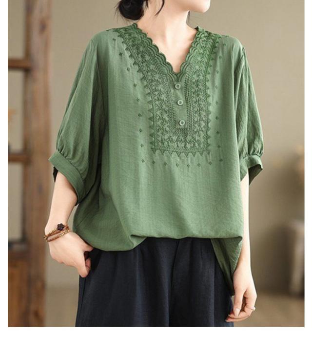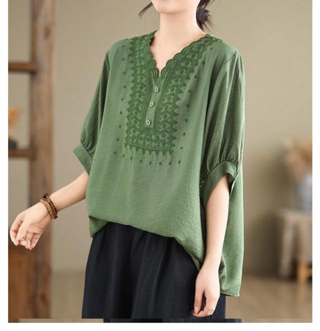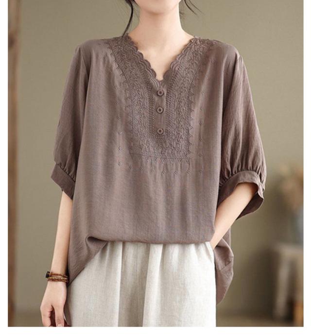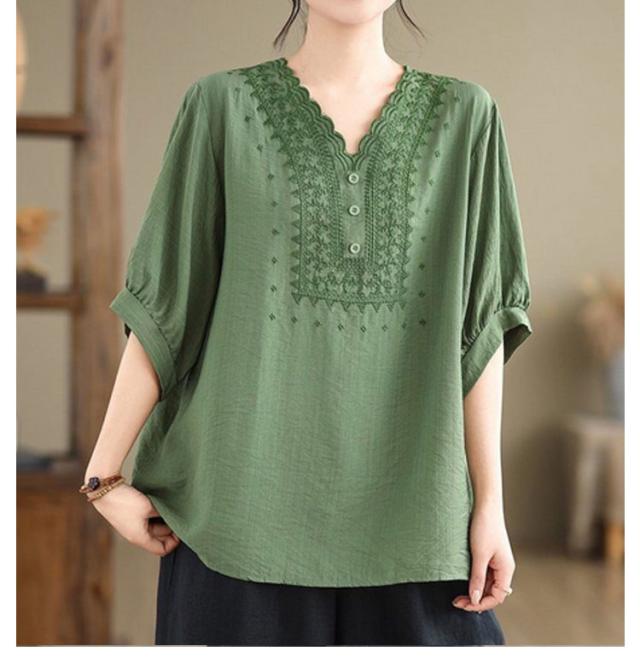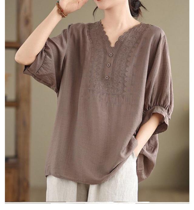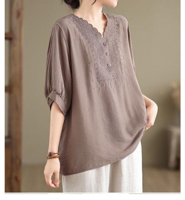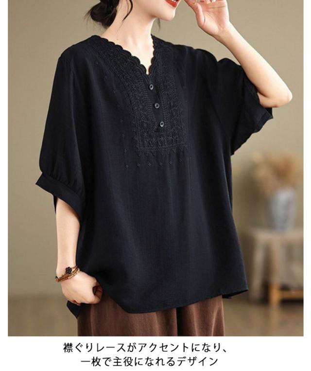 コットン シャツ リネン レディース プルオーバー ブラウス シャツ チュニック Vネック 七分袖 ふんわり 花柄 綿麻風ブラウス ブラウス 大きいサイズ ゆったり 体型カバー 刺? 花柄 大きいサイズ ゆったり ナチュラル きれいめ