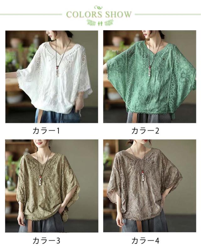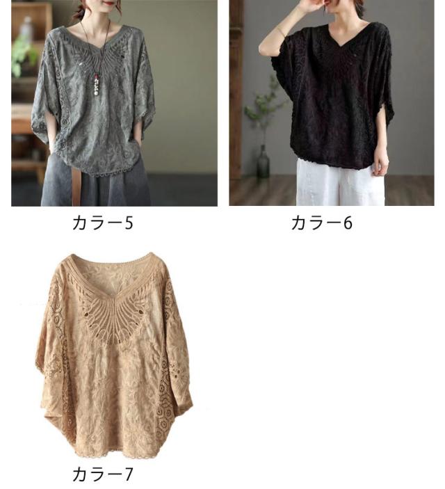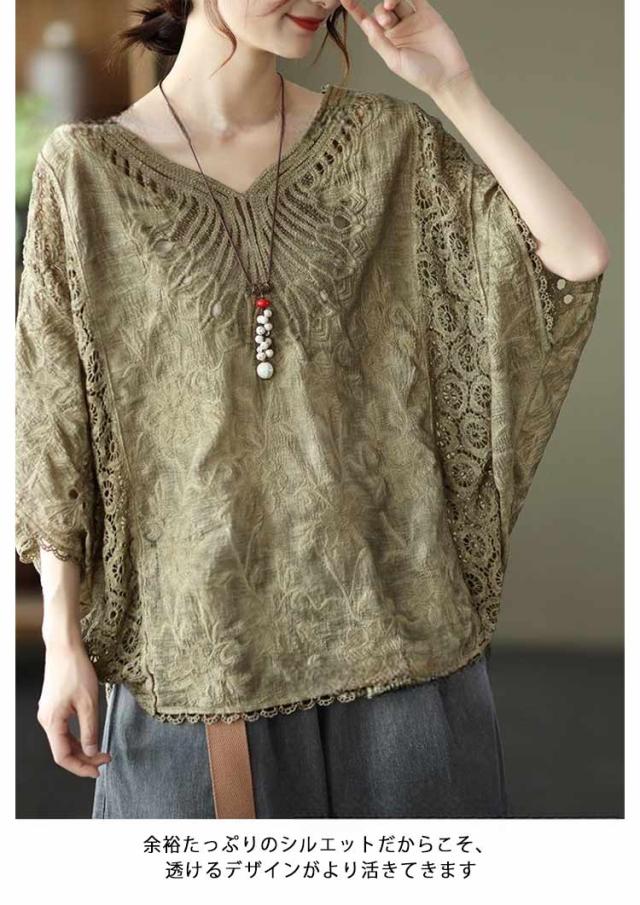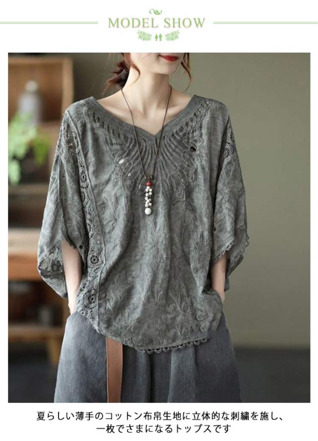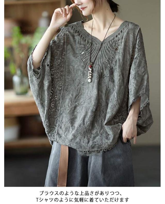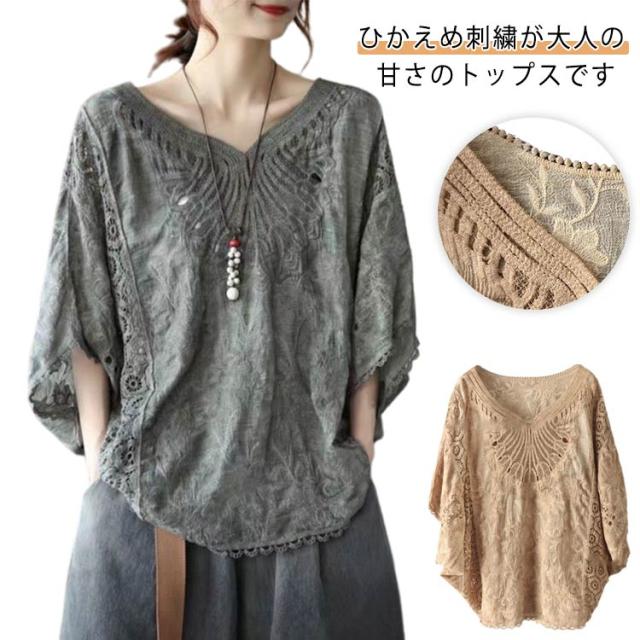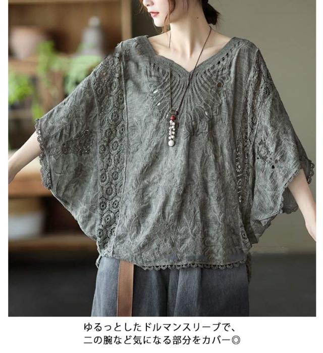 tシャツ 夏 Vネック ドルマンブラウス レディース 刺繍 森ガール ドルマンスリーブ ブラウス 大人可愛い 透け感 カットソー ふんわり ナチュラル チュニック 刺? 五分袖 トップス ドルマンブラウス レース ブラウス 花柄 Tシャツ 大人 かわいい ナチュラル