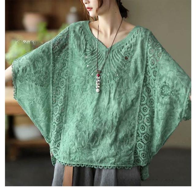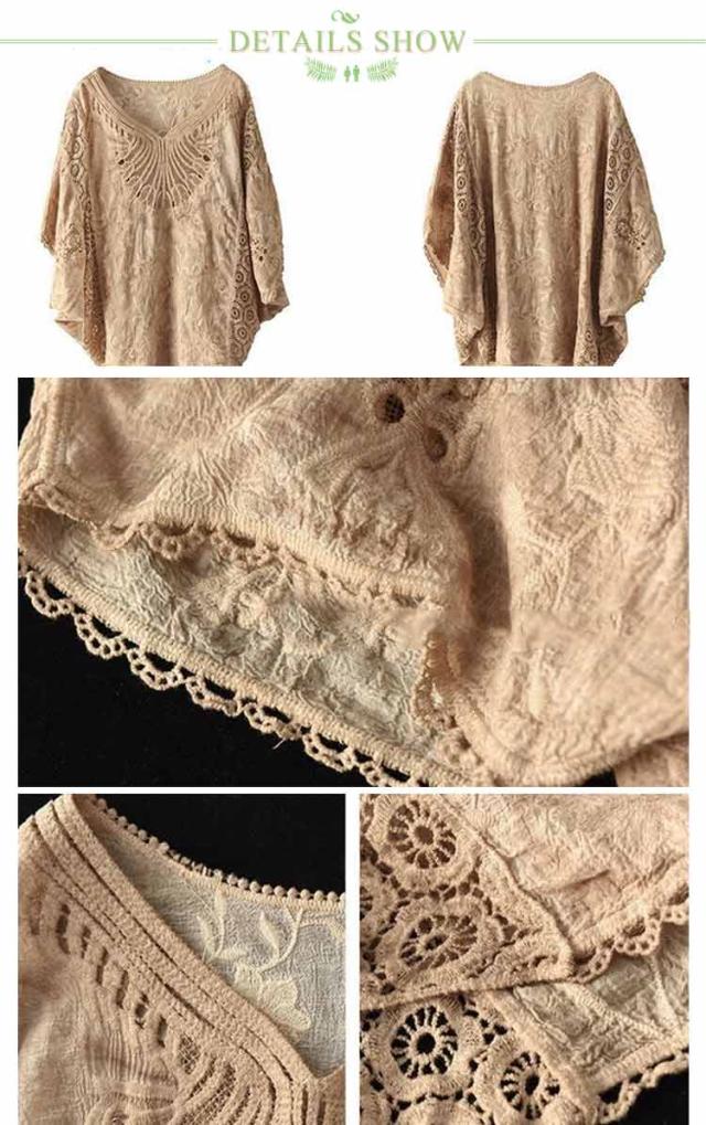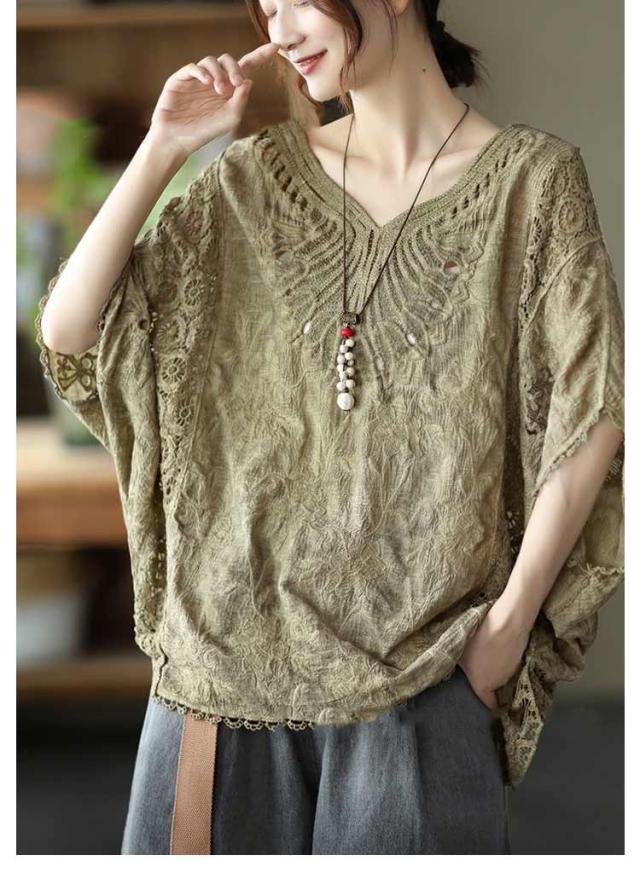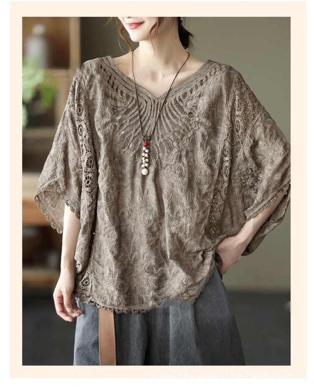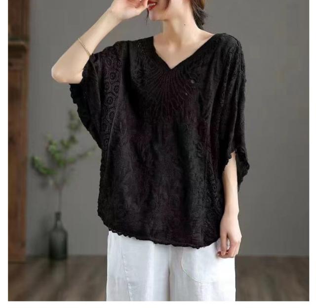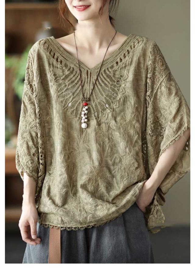 tシャツ 夏 Vネック ドルマンブラウス レディース 刺繍 森ガール ドルマンスリーブ ブラウス 大人可愛い 透け感 カットソー ふんわり ナチュラル チュニック 刺? 五分袖 トップス ドルマンブラウス レース ブラウス 花柄 Tシャツ 大人 かわいい ナチュラル
