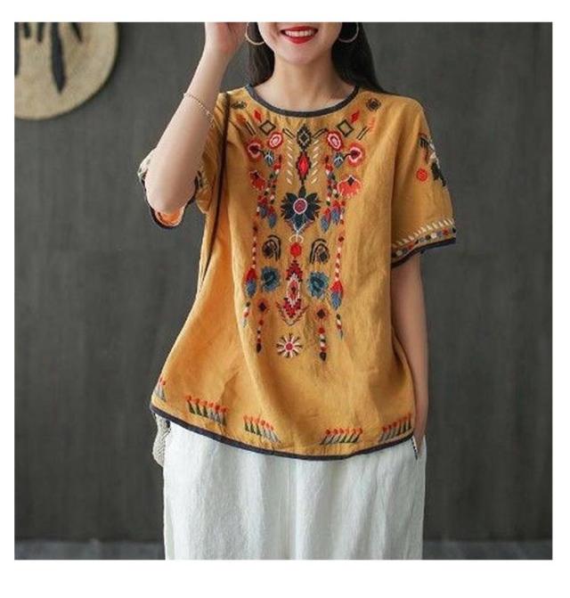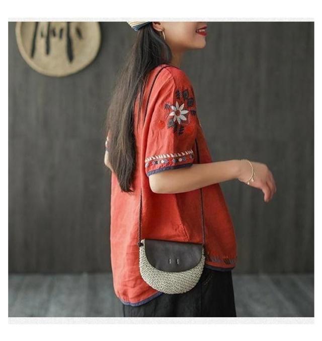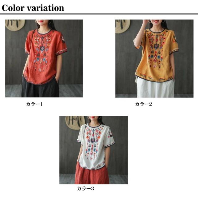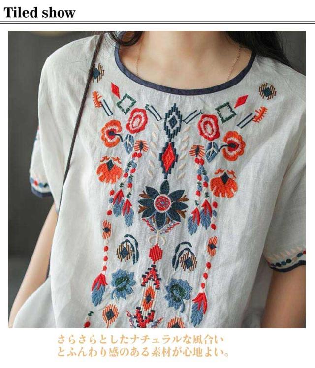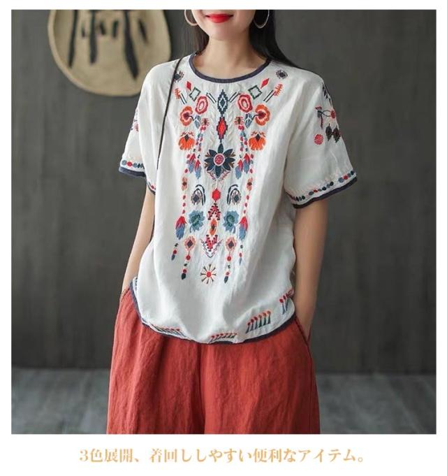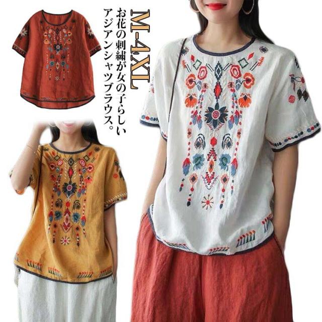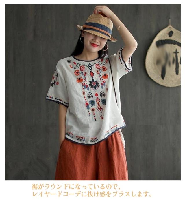 半袖 刺繍 薄手 半袖シャツ 大きいサイズ ブラウス 刺繍 トップス ラウンドテール 花柄刺繍 Tシャツ プルオーバー レディース カットソー 春 夏 ナチュラル きれいめ M L XL 2XL 3XL