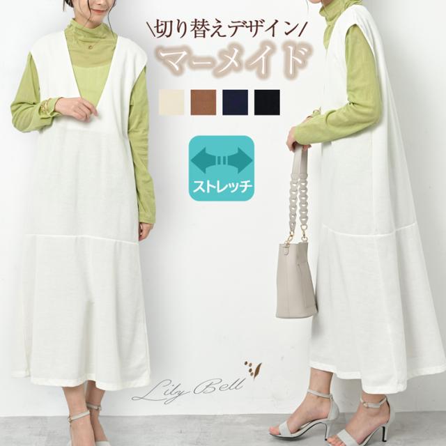 ・裾の切り替えから緩やかなフリルシルエットが楽しめる マーメイドワンピース 。インナートップスで印象が変わるのでカジュアルスタイルからきれいめスタイルまで 大人可愛い シンプル ベーシック な カジュアル スタイルを楽しめます。