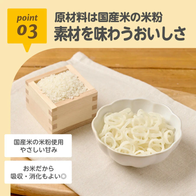 ・緑のやさい:米粉(米(国産))、野菜プレミックス(ケール末、ブロッコリー末、ヨモギ末、アスパラガス末、オクラ末、コマツナ末、カボチャ末、ダイコン葉末、パセリ末、ホウレンソウ末)