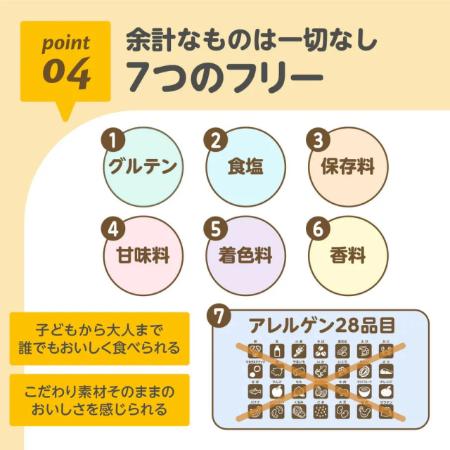 小麦粉不使用、保存料・防腐剤、グルテンフリー、アレルゲン28品目不使用