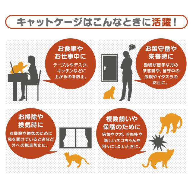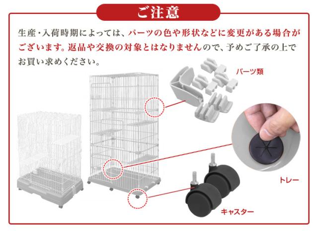 | 注意事項 | ・組み立て式(未完成品)です。 ・ペットの予期せぬ行動から発生したケガや事故・破損に対する保障は致しかねます。 ・表示されている耐荷重以上では絶対に使用しないでください。商品が破損したり、ケガをする恐れがあります。 ・生後間もない幼猫にご使用の場合、フェンスの隙間から頭や体が出る恐れがありますので注意してください。 ・写真と実物は多少異なる場合がございます。あらかじめご了承下さい。 ・商品は、モニターによって色合いが異なって見える場合があります。 ・仕様・デザインは改良のため予告なく変更することがあります。 |