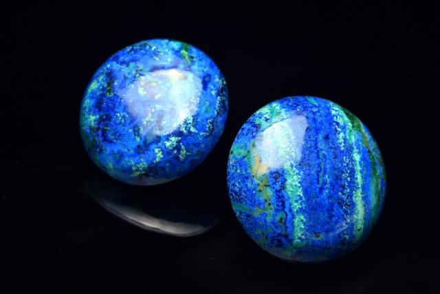 | 特徴・意味 | アズライトのブルーがまるで地球のようで美しいルースです。 地球の様なカラーは見ているだけでほっと落ち着きをもたらしています。 巾着に入れてお守りにしたり、ワイヤーアートやマクラメ編みにもオススメのアイテムです。 ランダム発送のため模様はそれぞれ異なります。 青と緑の2種類の鉱物が混ざり合ったアズロマラカイトは、芸術的な美しさを持ちます。 青い部分は「アズライト」と言い、和名「藍銅鉱(らんどうこう)」 緑の部分は「マラカイト」と言い、和名「孔雀石(くじゃくいし)」 この2種類が混ざっています。 この2種類の鉱物はよく似ており、アズライトは空気中の水分を含むと、マラカイトへ変質します。 つまりアズロマラカイトは、時が経つと緑色のマラカイト部分が多くなってしまう可能性が有ります。 この他の石にはない特性がアズロマラカイトの魅力です。 |