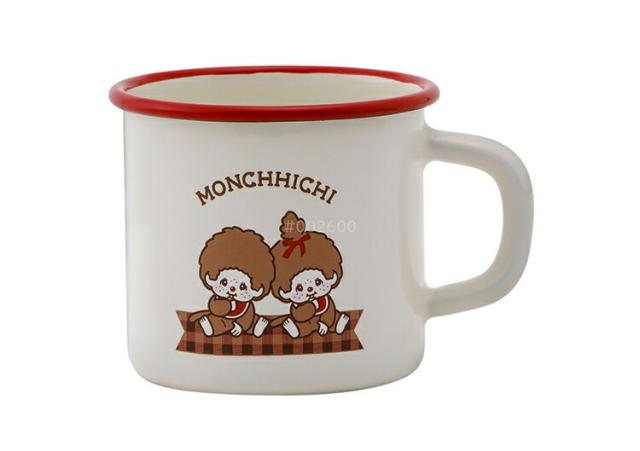 | レトロな雰囲気の赤いチェック柄がかわいい モンチッチをデザインしたホーロー製のマグカップです。
