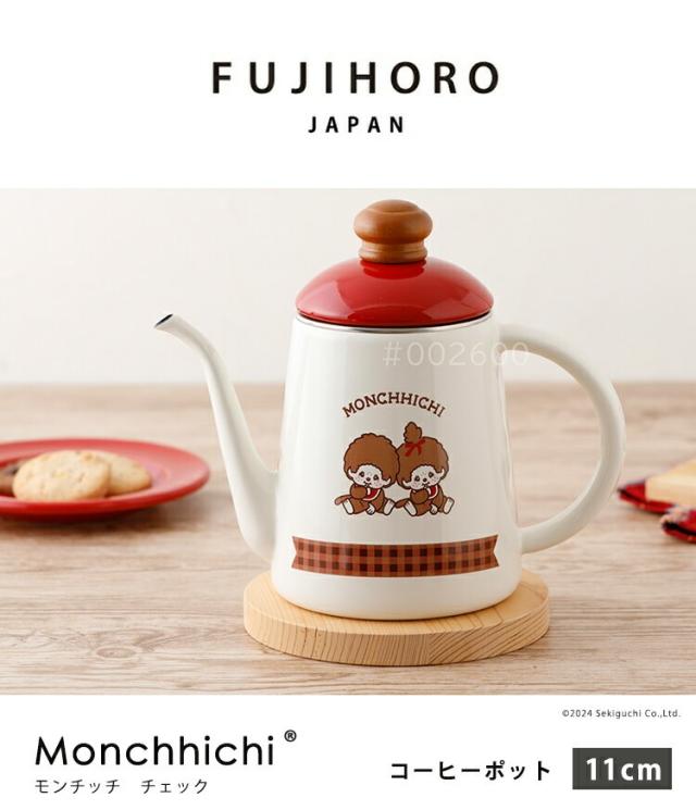 【 富士ホーロー 公認商品 】1.0L コーヒー ドリップポット 直火 モンチッチ おしゃれ 北欧 コーヒーポット 細口ポット やかん ホーロー ケトル レトロ懐かしい モンチッチ チェック MNC-11CP (11cm) ハンドドリップポット ドリップケトル コーヒー用ポット 細口 可愛い
