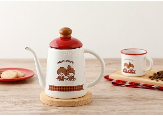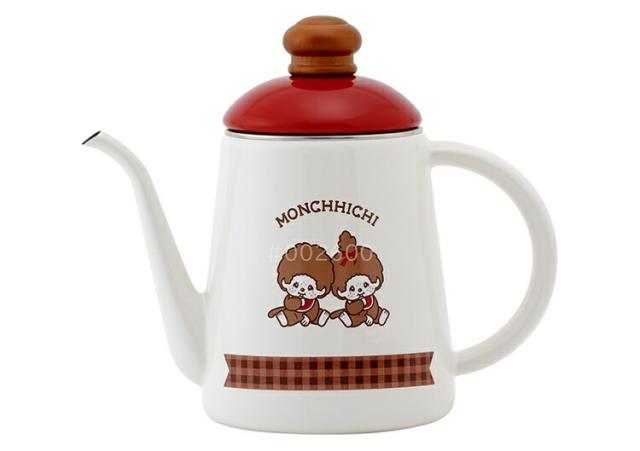 | レトロな雰囲気の赤いチェック柄がかわいい モンチッチをデザインしたホーロー製のコーヒーポットです。