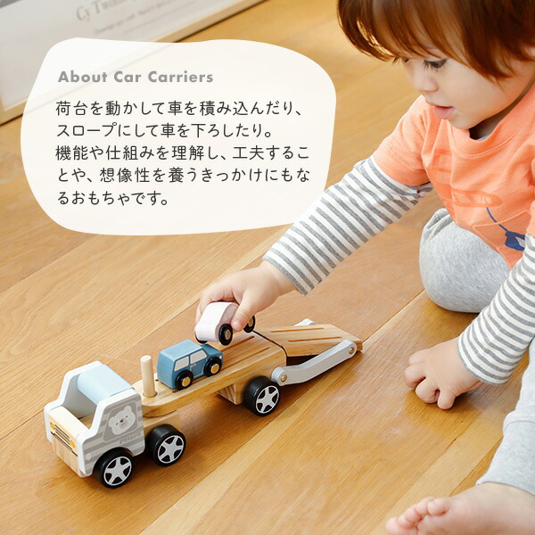 | 商品説明 | ●対象:2歳から ●北欧テイストをベースにしたペールトーンカラーの木製玩具 ●3台の車が付属する2階建てのキャリアカー ●荷台を動かして車を積み込んだり、スロープにして車を下ろしたり。機能や仕組みを理解し、工夫することや想像性を養うきっかけにもなるおもちゃです |
